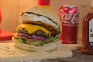 Hambúrguer artesanal grelhado na churrasqueira, coberto com queijo prato